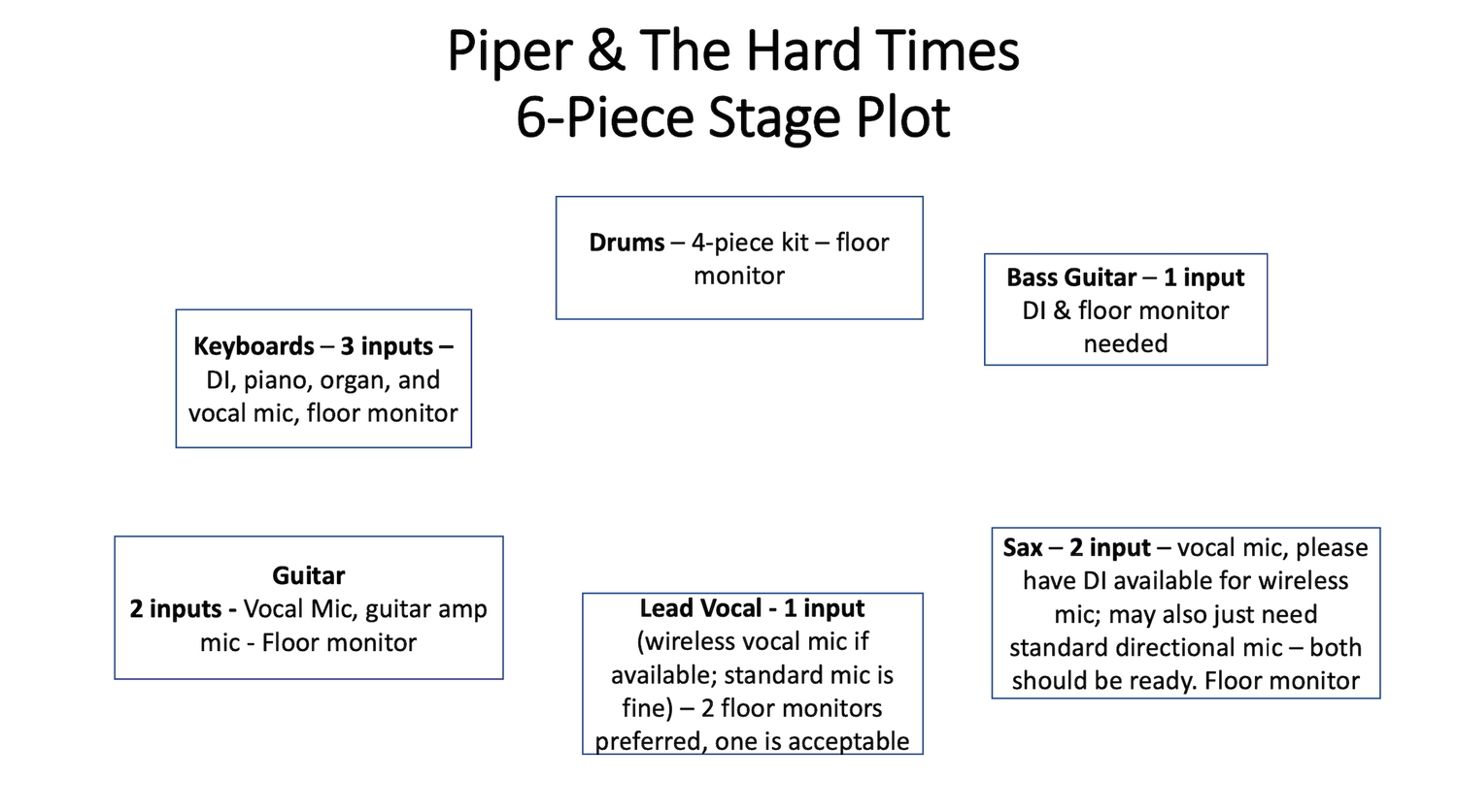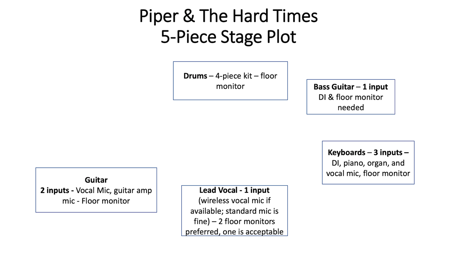 Piper & The Hard Times has an instrumental prowess that enables them to improvise with flair, while still creating music that has a melodic appeal and can immediately connect with audiences that want both a high degree of musical competence and songs with a strong grooves and catchy hooks.